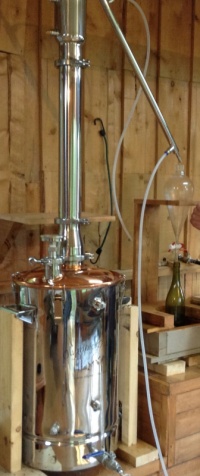 Processus de distillation: La partie inférieure de la cuve, remplie d’eau, est chauffée avec l’électricité. L’eau est amenée à ébullition et la vapeur passe à travers les tiges/fleurs. La vapeur monte dans le col de cygne et descend dans le refroidisseur et produit l’hydrolat et l’huile. L’essencier sert à recueillir le tout. Le processus de distillation est complété.